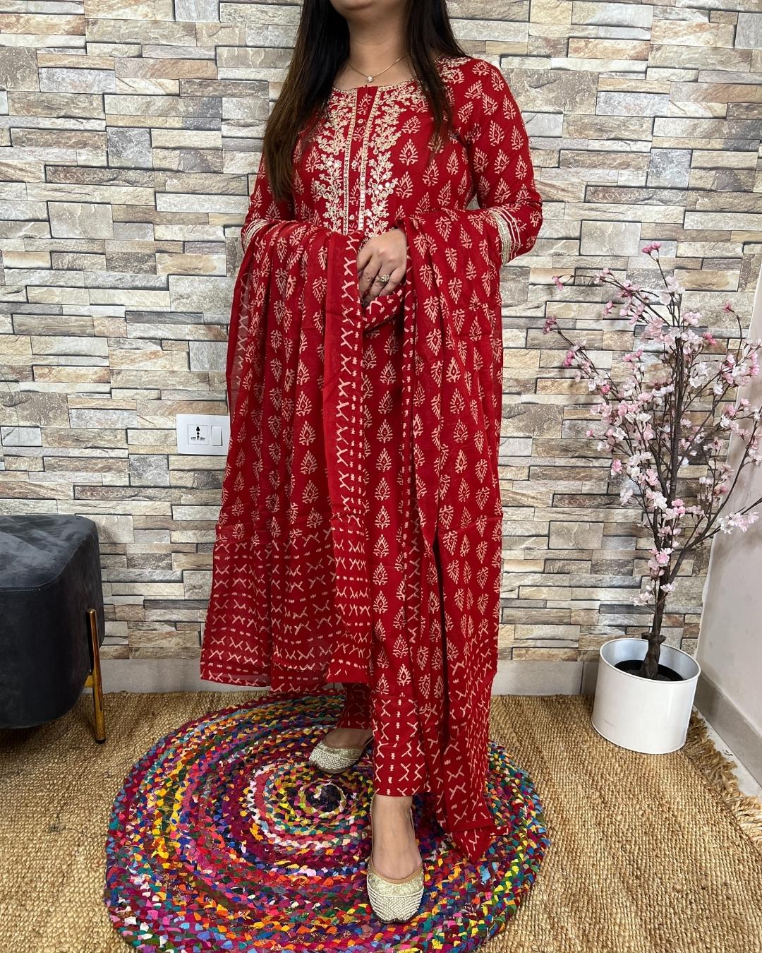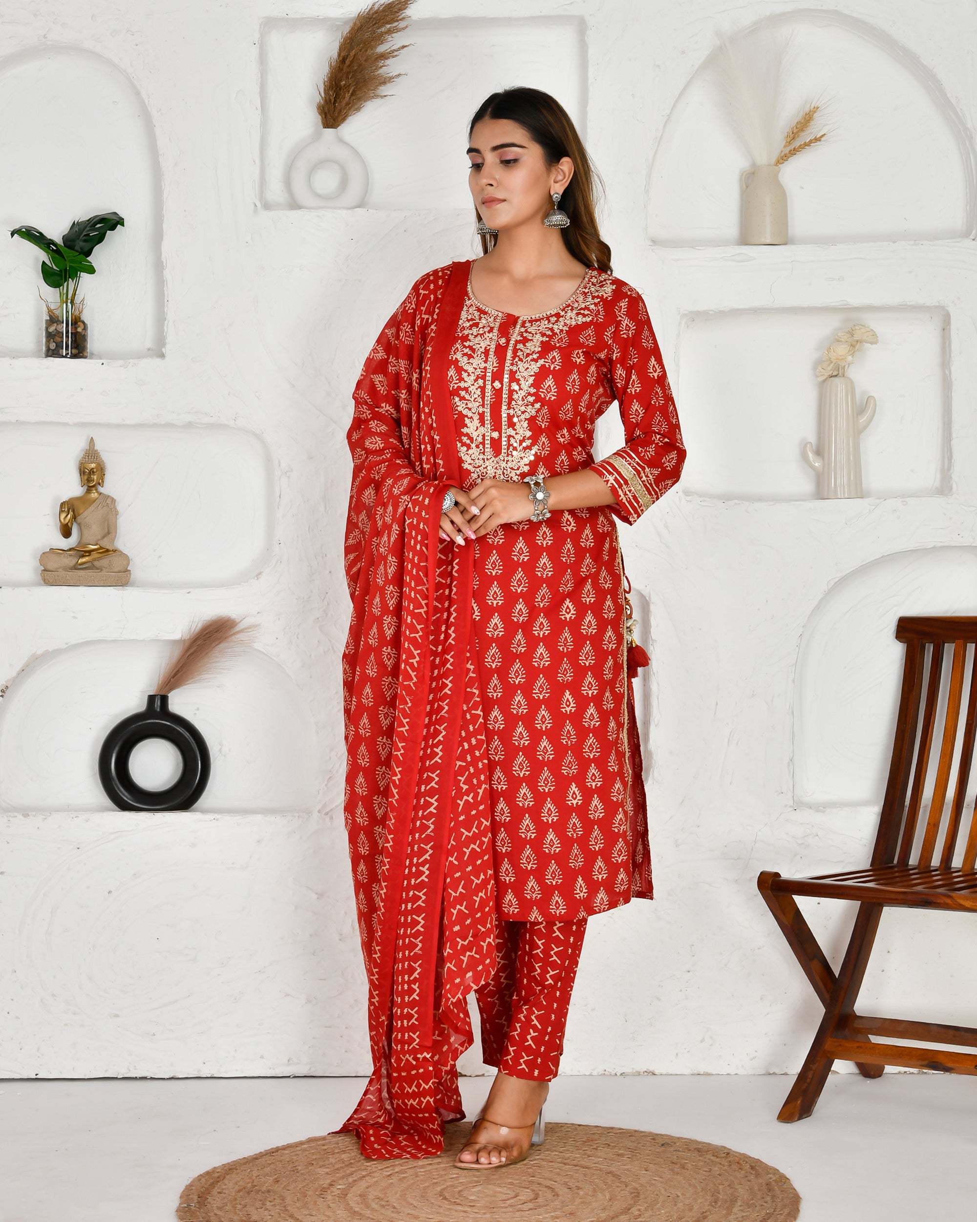 Delight in the comfort of our casual pant-set, tailored from authentic Jaipuri cotton. The neckline is graced with intricate Zari embroidery, offering a shimmering contrast to the soft cotton backdrop. Perfect for the discerning woman who seeks a touch of opulence in her daily attire, this ensemble melds traditional craftsmanship with contemporary comfort. Step out with understated grandeur, every day.