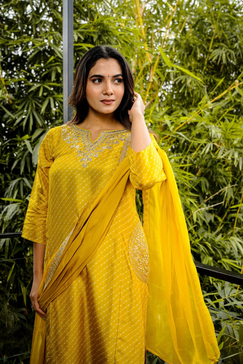 A masterpiece in Russian silk, this pant set is elevated with meticulous hand embroidery that adds a touch of finesse. Paired with a breathtaking Bandhani print, it exudes an air of effortless sophistication.