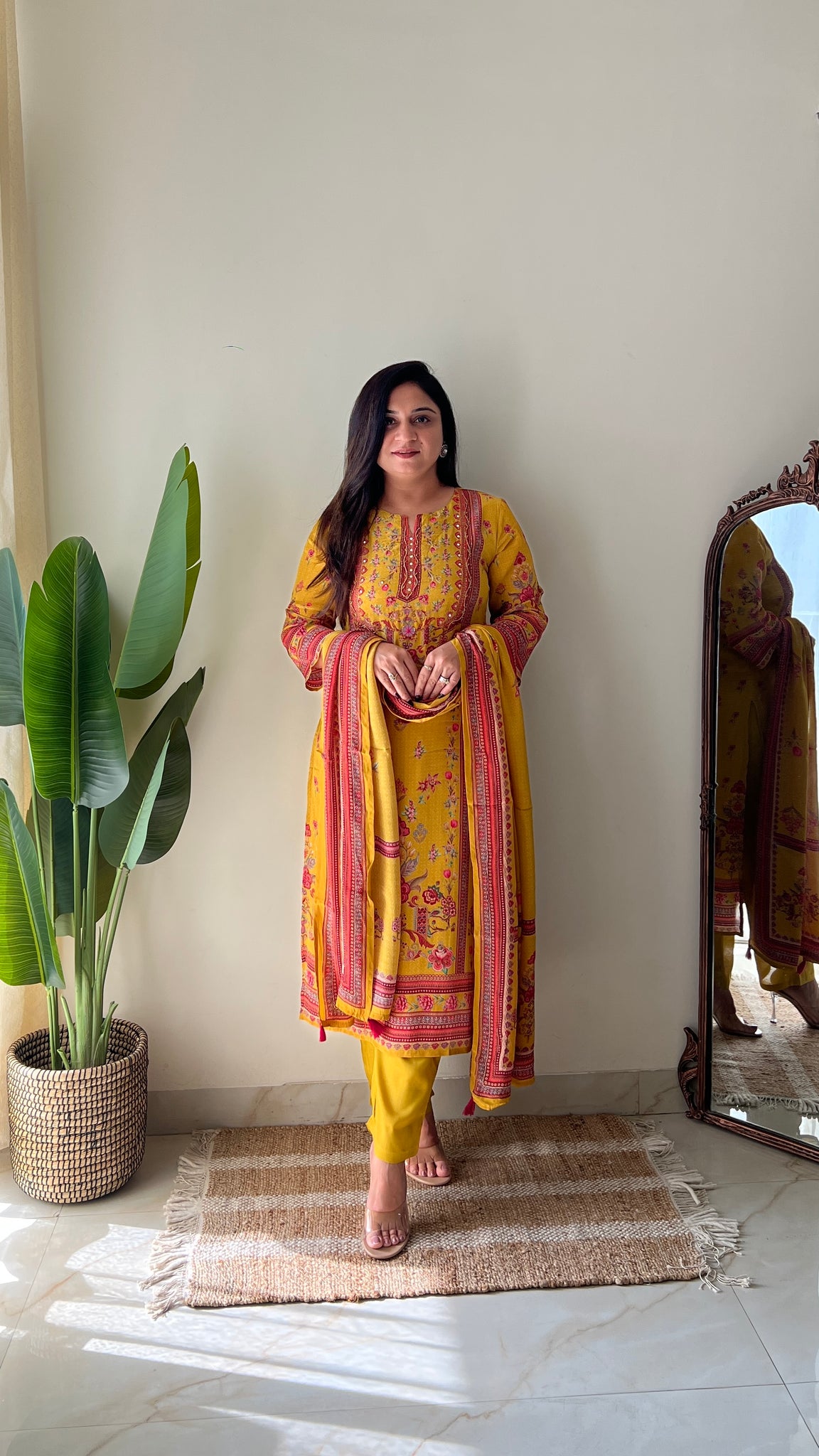 Rahma Crepe HandEmbroidered Straight Pant Set Yellow