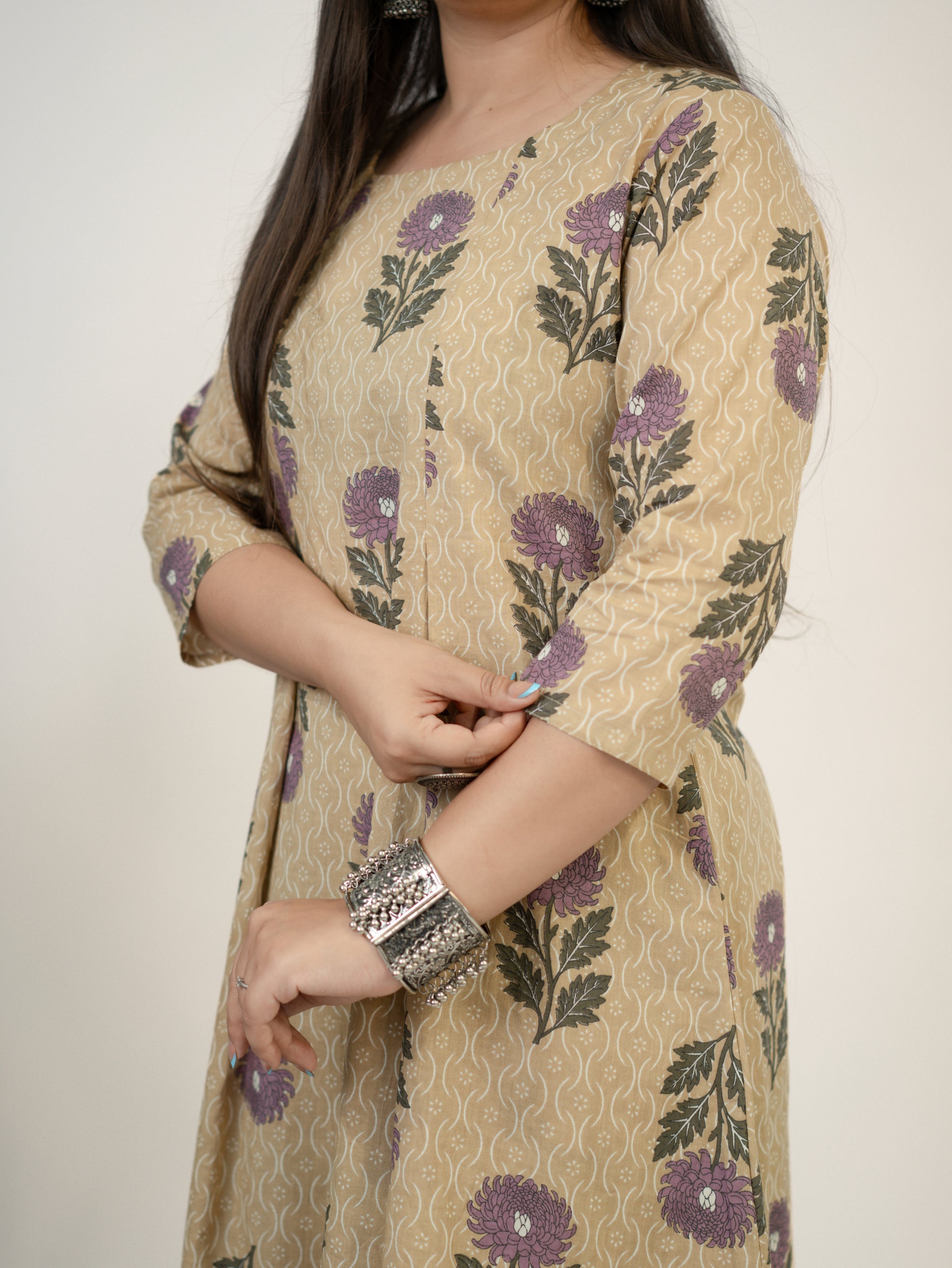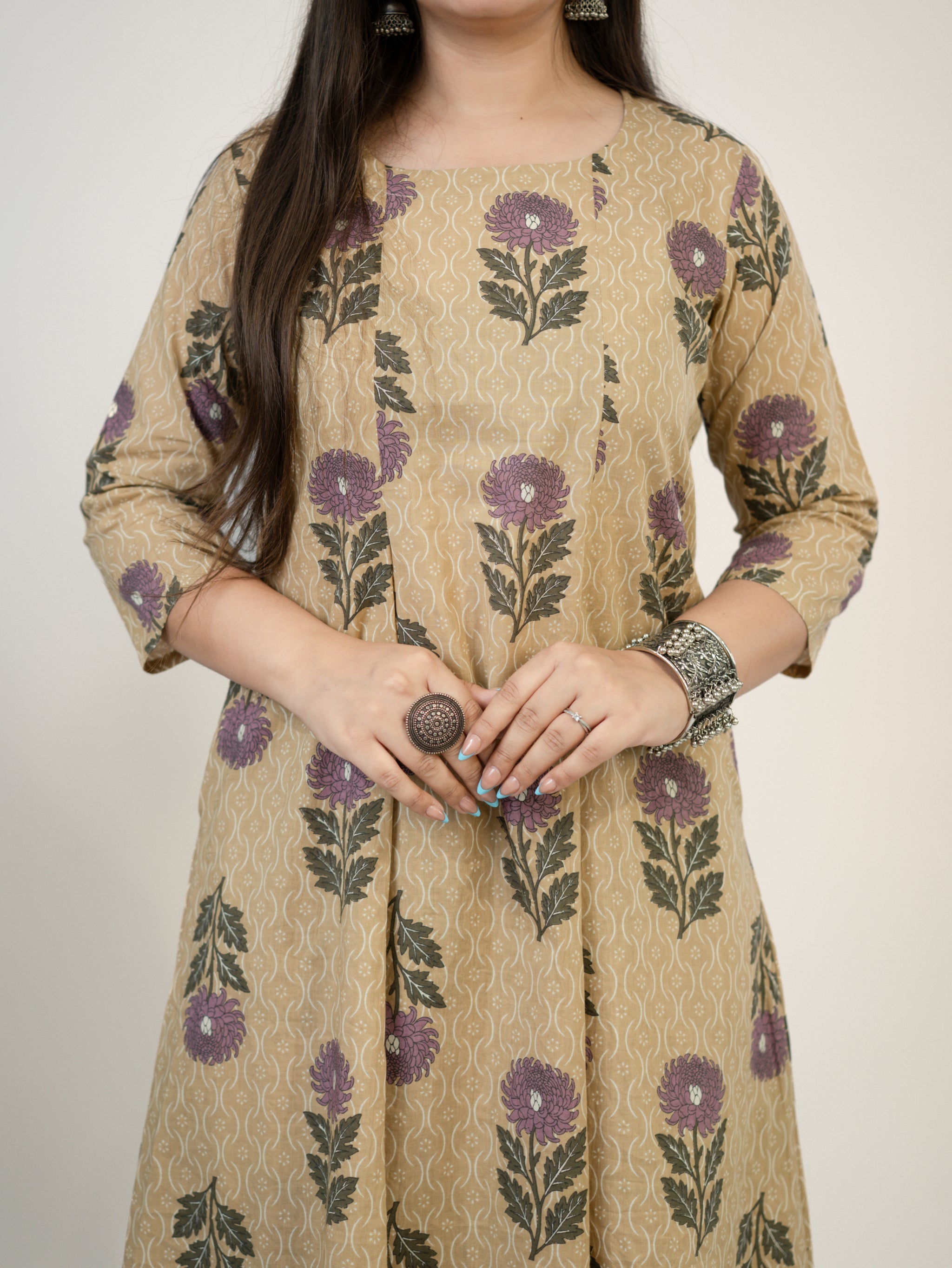 Ayaat Beige Cotton Floral Pleated A-line Kurta Set