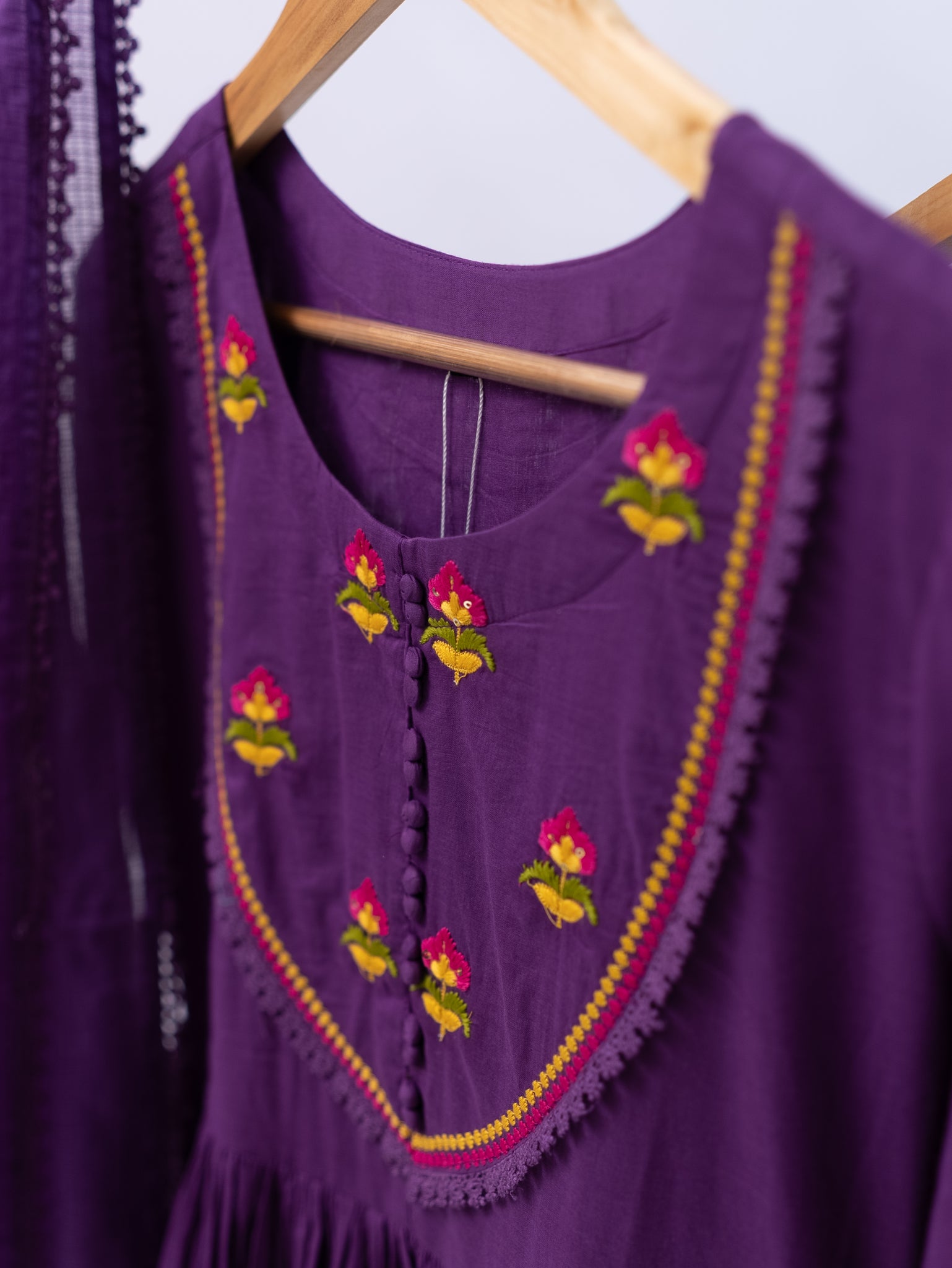 Vrishti Purple Mul Cotton Embroidered Anarkali Dupatta Set