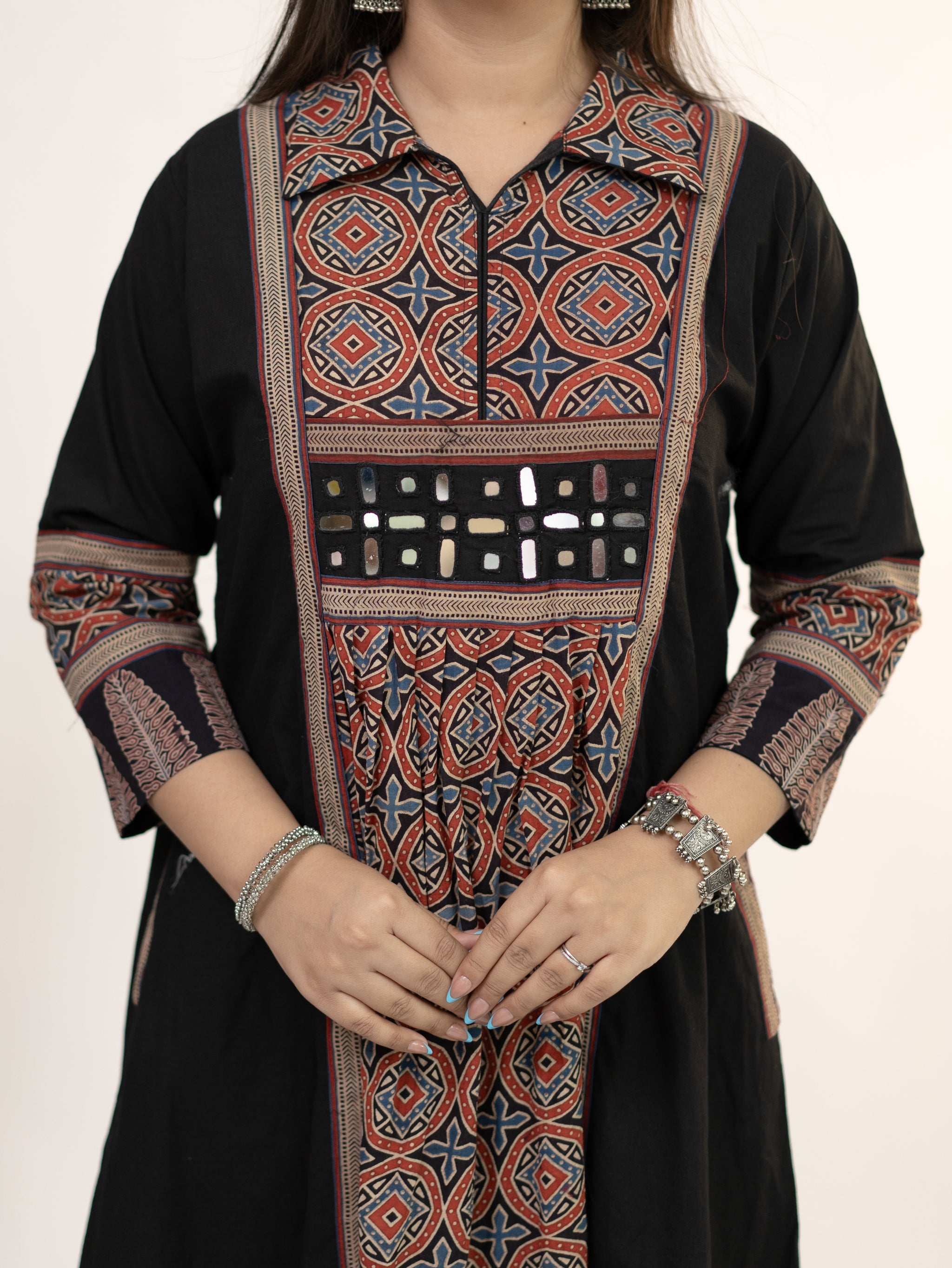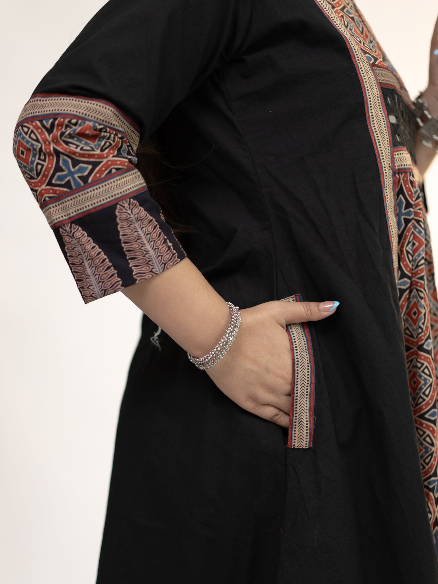 Diyara Black Cotton Ajrakh Kutch Embroidered A-line Kurta