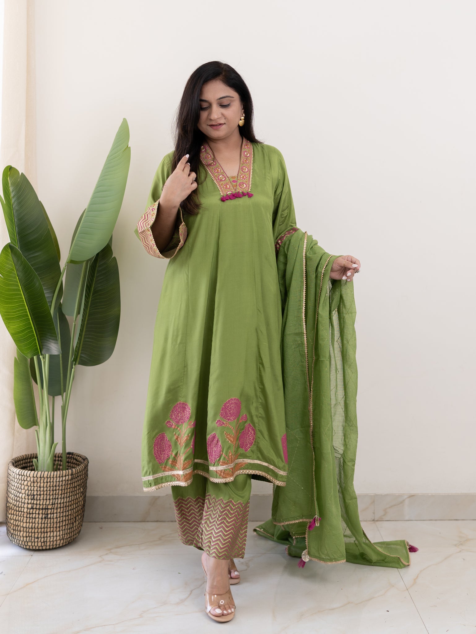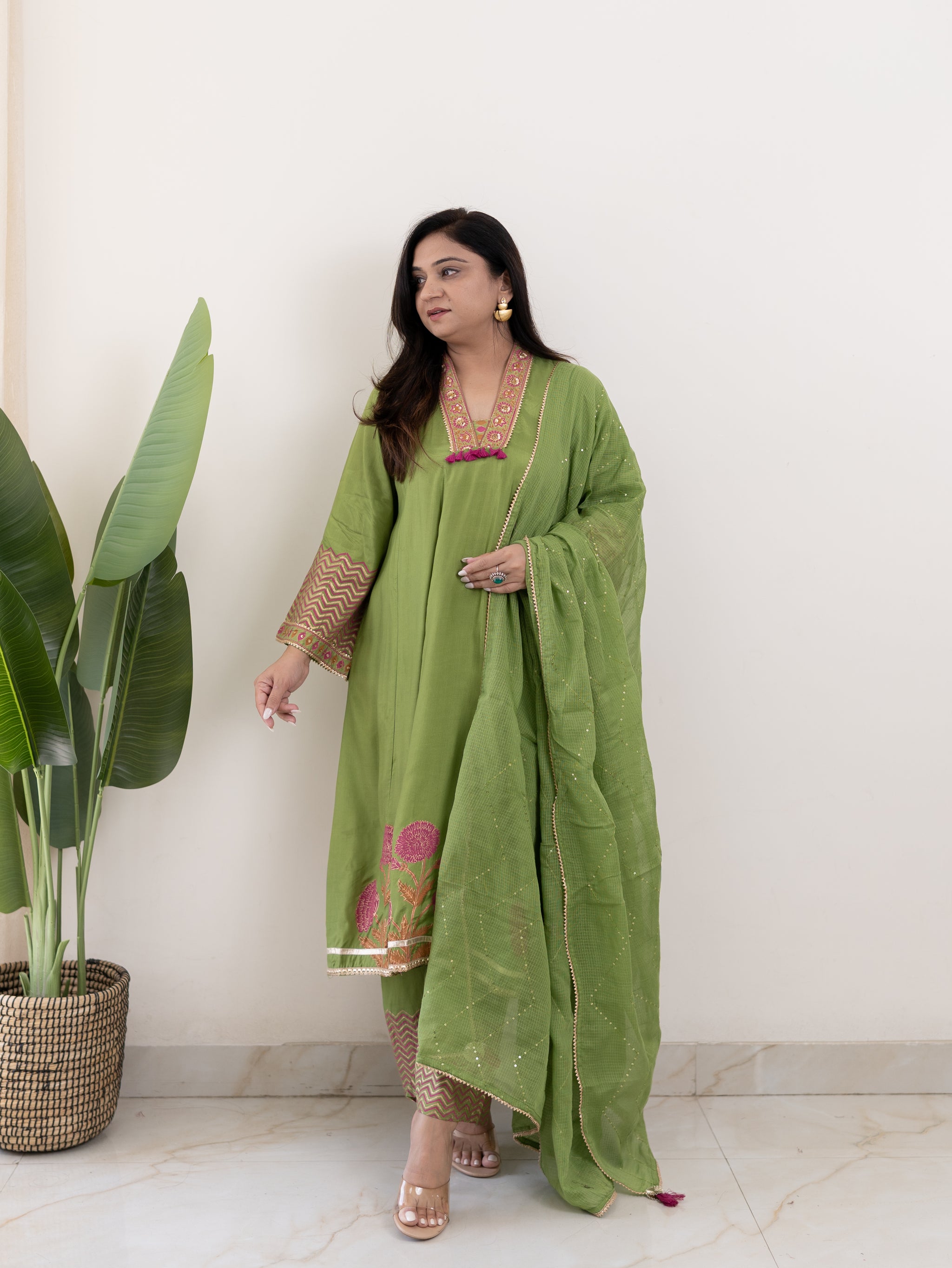 Jasmine Green Muslin HandEmbroidered Anarkali Dupatta Set