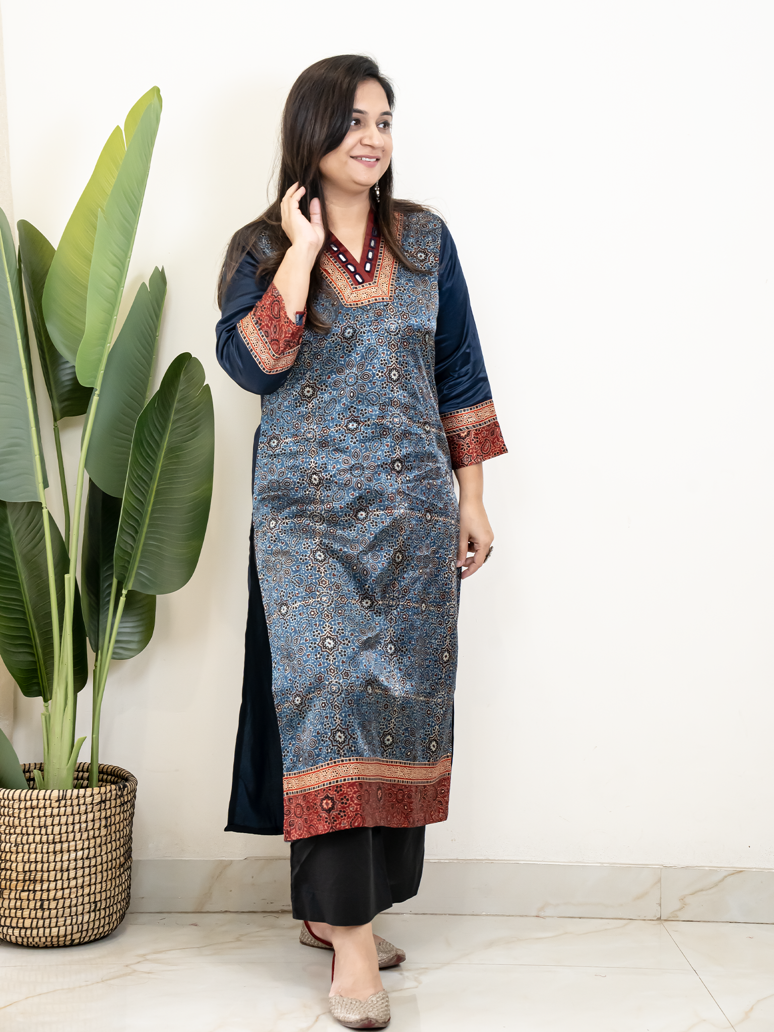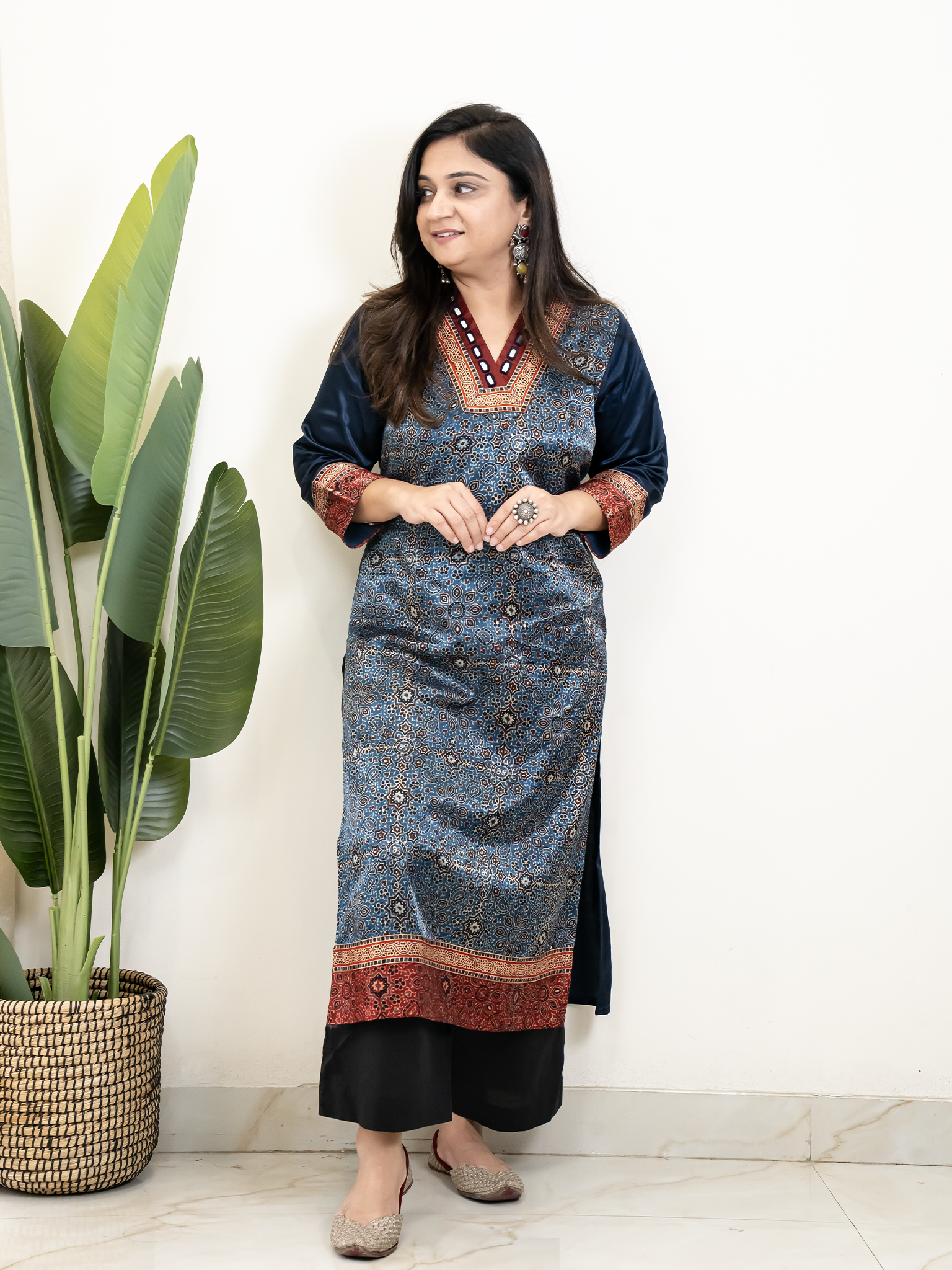 Introducing the Norah Mashru Silk Kurta—where timeless Ajrakh artistry meets contemporary elegance. This straight-cut beauty features authentic Kutch embroidery that dances across premium mashru silk, creating a piece that's equally at home at festive celebrations or casual gatherings. Versatile, handcrafted, and undeniably stunning, it's the kurta that does it all.