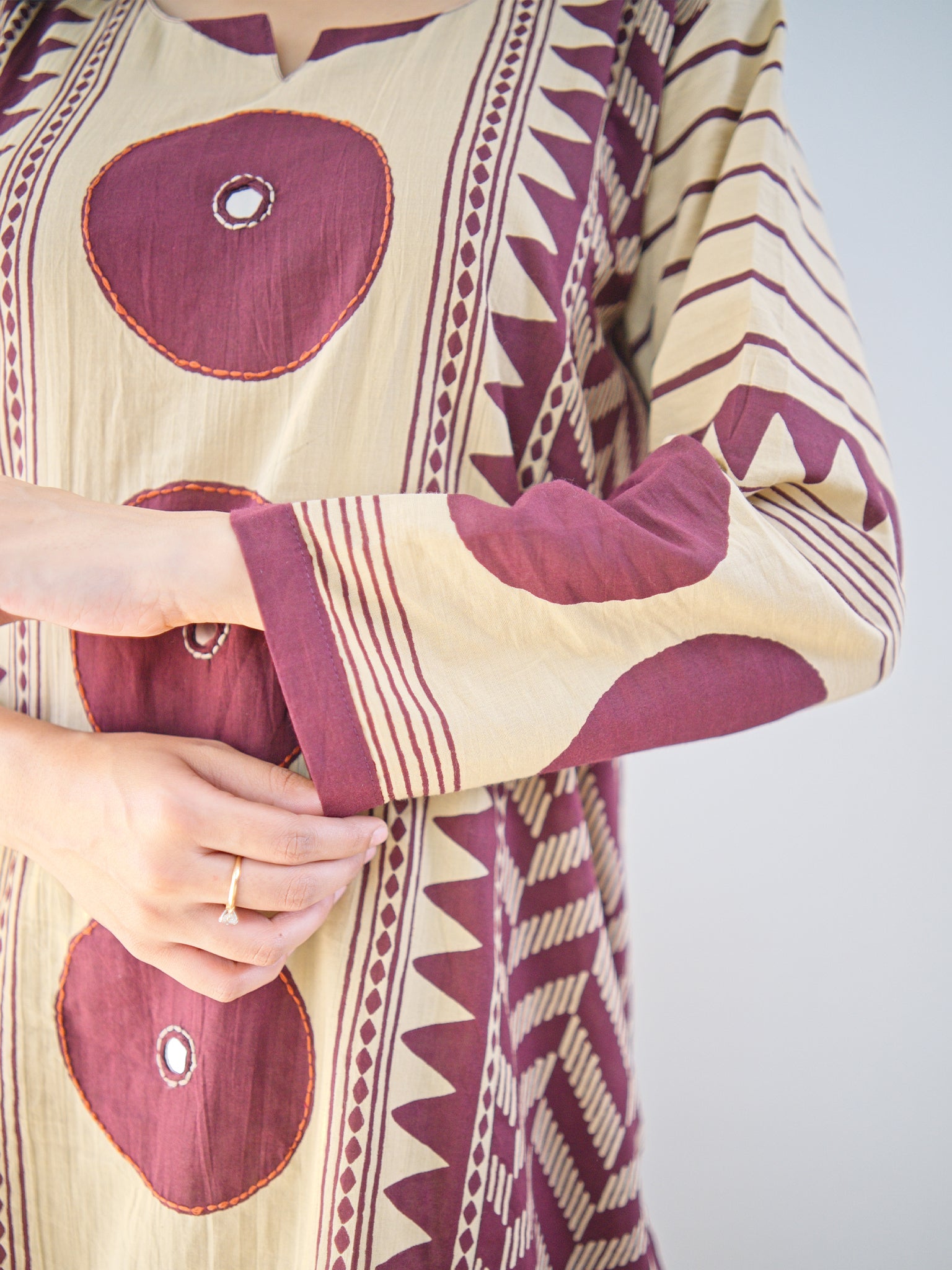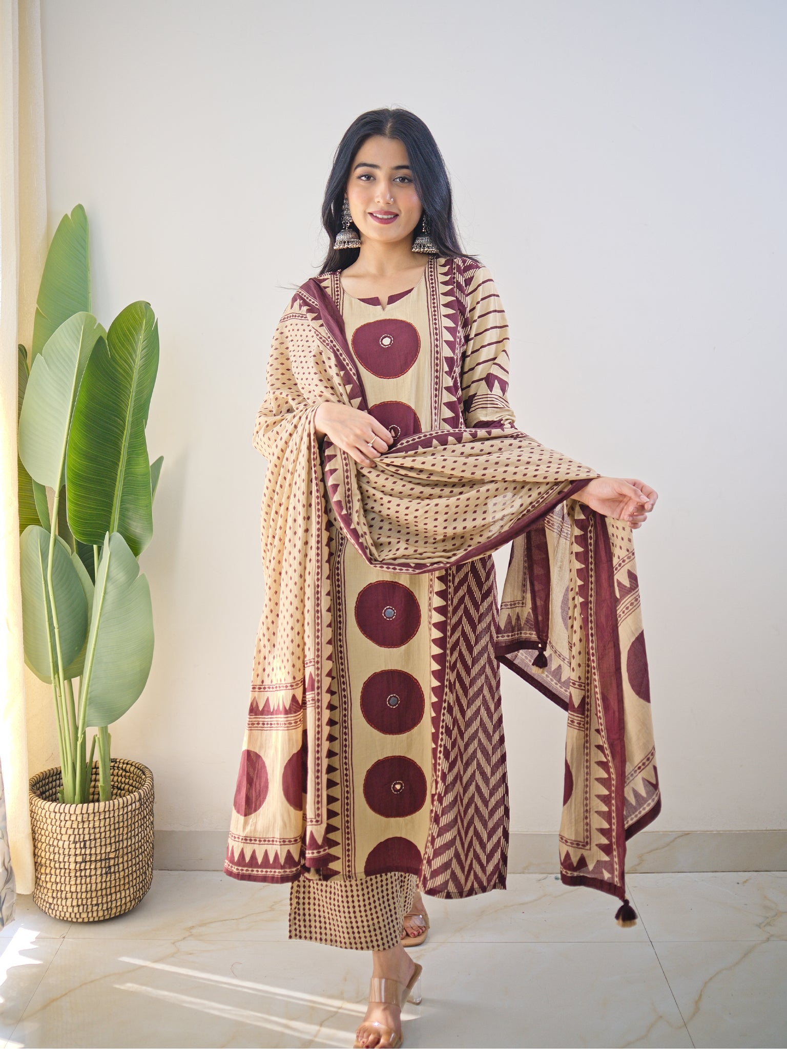 Artisanal ajrakh and handblock printing converge in this sophisticated dupatta set, enriched with intricate katha embroidery and geometric patterning. Crafted from breathable mul cotton, this piece transitions seamlessly from professional settings to everyday occasions, offering both visual depth and practical comfort for the discerning wearer.